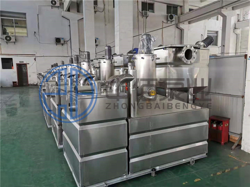 2、廢水在油水分離倉中,利用油水密度差原理,油污自動上浮到特制的集油裝置中,集油裝置頂部設置的放油閥與廢油收集桶連接,浮油在集油裝置中儲存達到一定高度時,打開放油閥,浮油自行流入設備旁邊放置的廢油收集桶中。油水分離倉中可選配全自動微氣泡發生器,加快油水分離速度,有利于油水充分分離。油水分離倉配有專用電加熱恒溫裝置,使油脂在較低溫度環境下不會發生板結。收集的廢油定期轉移至允許傾倒的地方。油水分離倉內的液位達到一定高度時,污水在壓力作用下通過回流管流入污水提升倉。